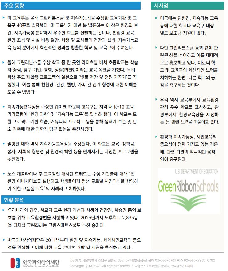 교육도 이젠 친환경과 지속가능성이 대세. 우수 성과 인정받은 미국의 그린리본스쿨