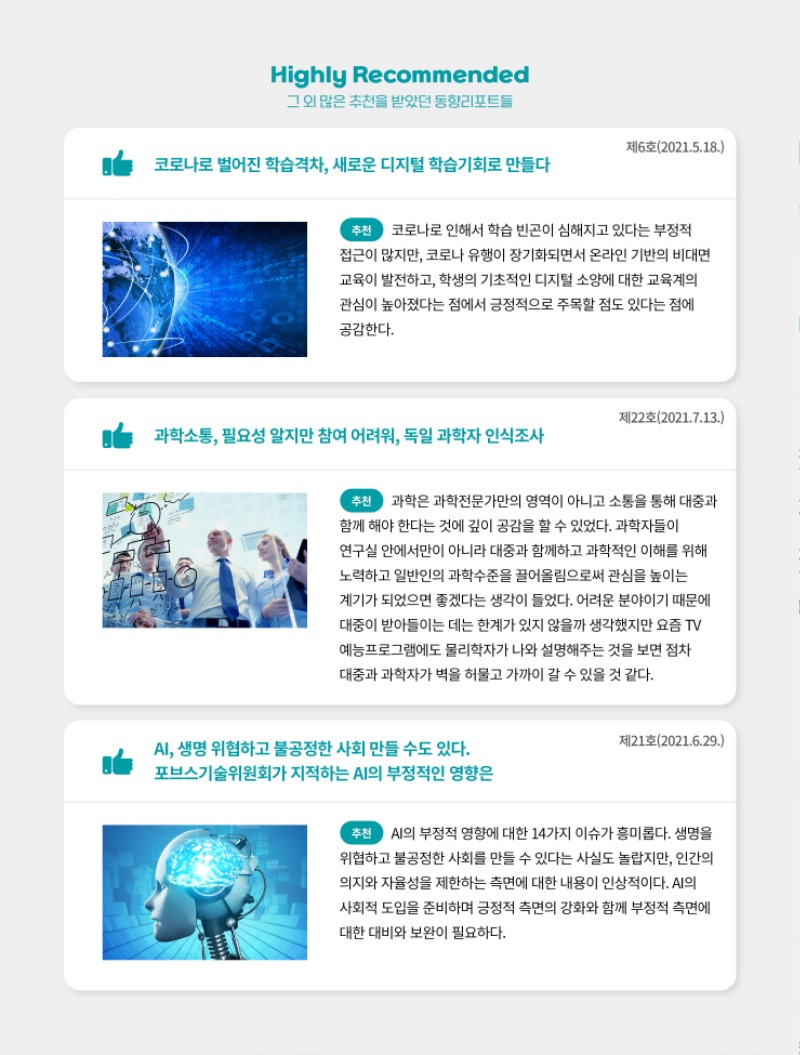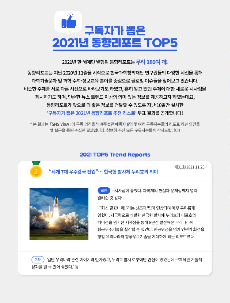 동향리포트가 앞으로 더 좋은 정보를 전달할 수 있도록 지난 10일간 실시한 ‘구독자가 뽑은 2021년 동향리포트 추천리스트’ 투표결과를 공개!