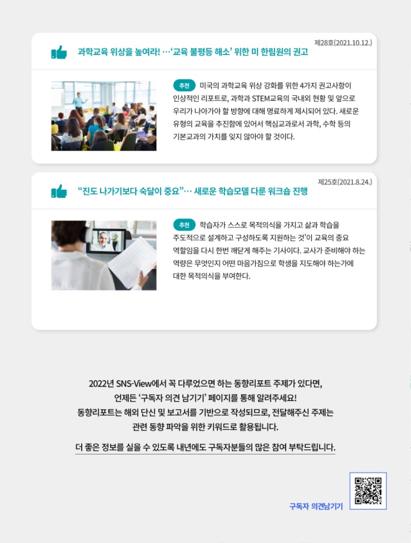 동향리포트는 지난 2020년 11월을 시작으로 한국과학창의재단 연구원들의 다양한 시선을 통해 과학기술문화 및 과학·수학·정보교육 분야를 중심으로 글로벌 이슈들을 짚어보고 있습니다. 비슷한 주제를 서로 다른 시선으로 바라보기도 하였고, 흔히 알고 있던 주제에 대한 새로운 시사점을 제시하기도 하며, 단순한 뉴스 트렌드 이상의 의미 있는 정보를 제공하고자 하였는데요,