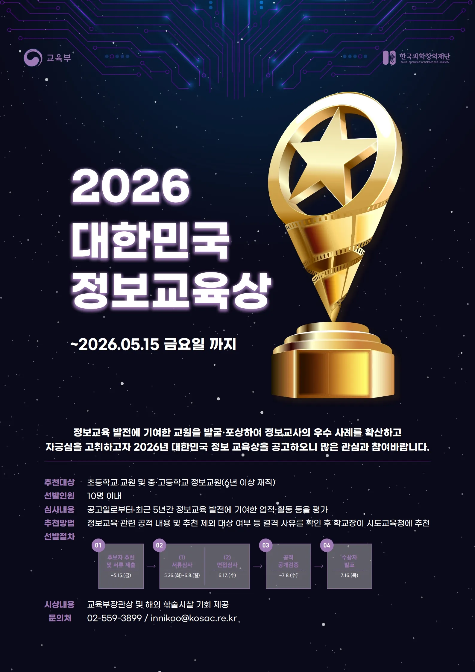 교육부 및 시도교육청이 주최하고 한국과학창의재단이 주관하는「2026 대한민국 정보교육상」을